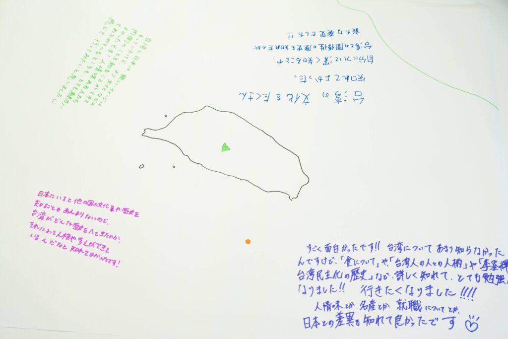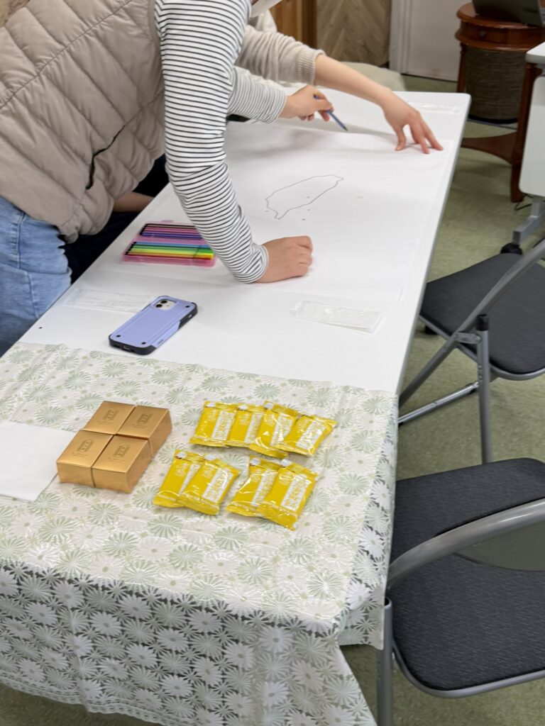 アイスブレイクは、台湾クイズ、白地図を目の前にして、台湾で、一番高い山を当てたり、台湾の朝食、文化、言葉についての全部で7問の質問。一番点数の高いチームには、台湾のお菓子が配られました。