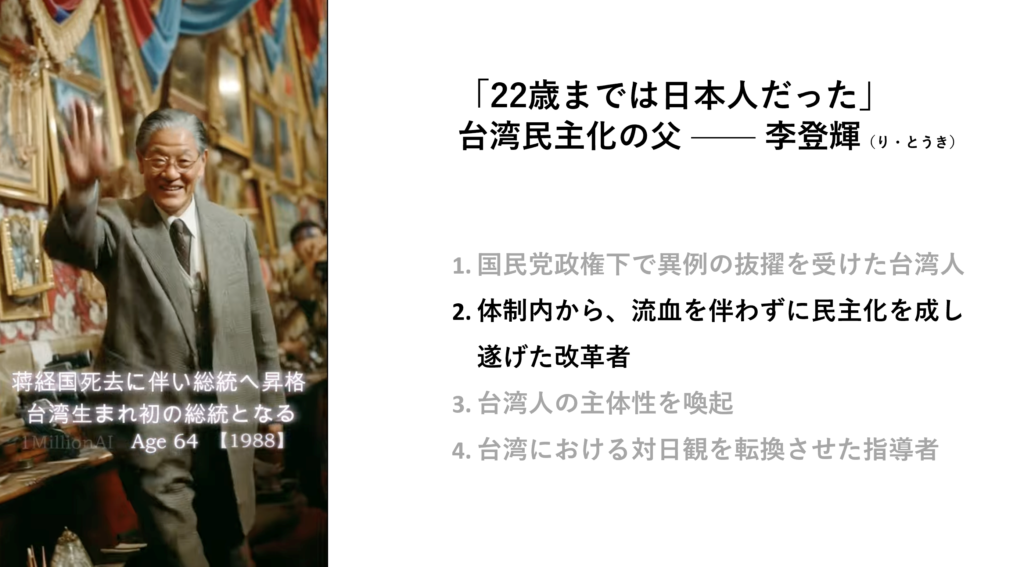 日本統治時代の台湾に生まれ、日本語も話すことができた李登輝さん。若い世代は初めて知る人も多く、日本人よりも日本のことを愛し、誰よりも台湾を愛した一人の指導者の姿を知ることになりました。